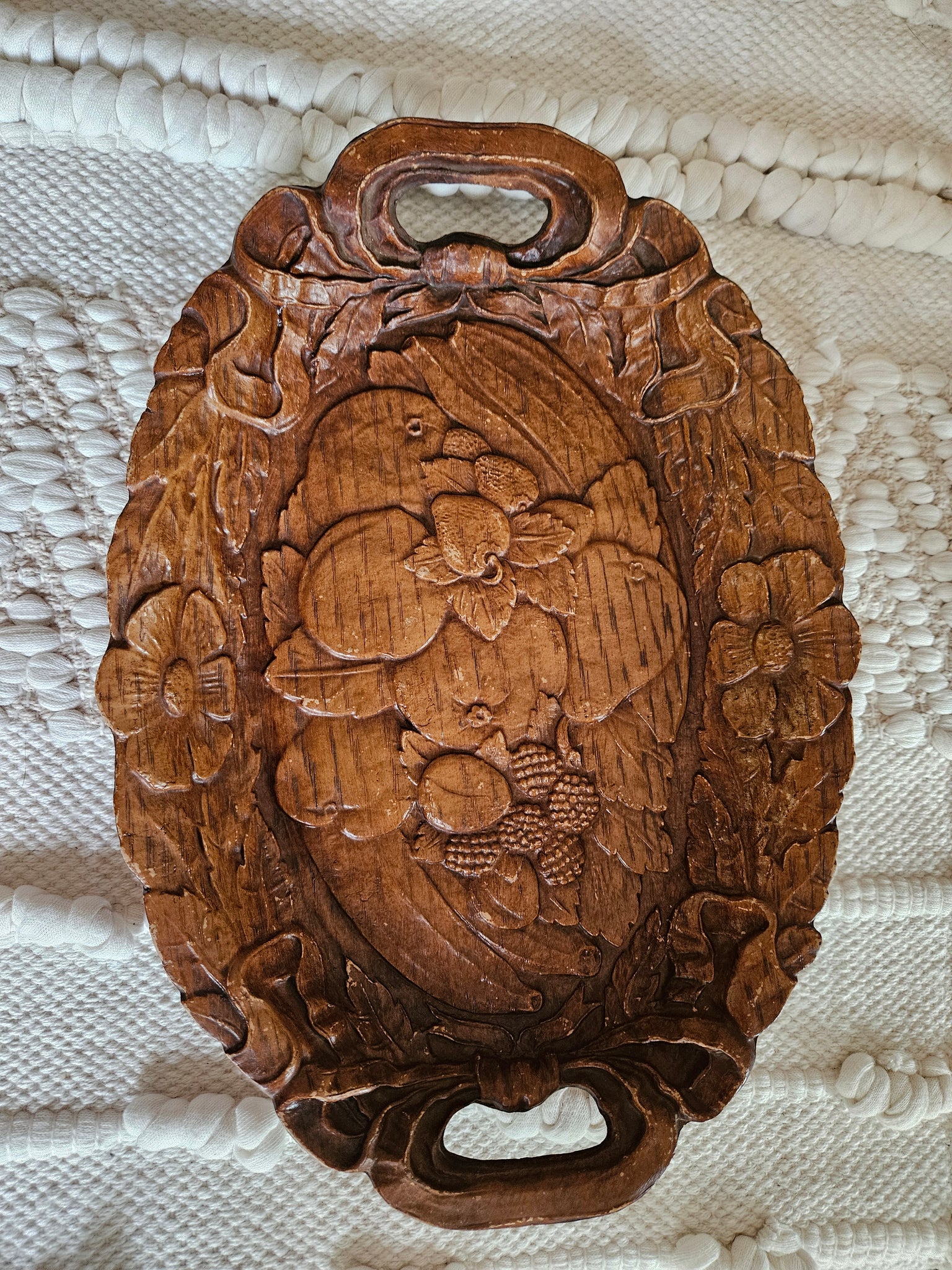1960s Burwood Products Company burwood fruit serving tray. Beautifully aged, the genuine burwood tray features an intricate floral and fruit pattern. It is oval in shape with two formed handles. Approximately 13"x9"x2". Wear is consistent with age but great condition.atching candlesticks available separately.